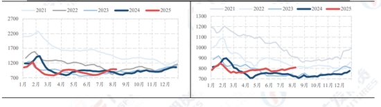 目前焦煤期貨合約主要對標(biāo)山西中硫主焦煤和蒙5精煤,現(xiàn)貨價格大漲后倉單成本不斷走高,形成期現(xiàn)共振上漲的局面。根據(jù)汾渭統(tǒng)計,截至8月11日現(xiàn)貨不同煤種焦煤價格分別為:CCI山西中硫主焦S1.3報價1260元/噸、甘其毛都蒙5原煤報價990元/噸,分別較前期低點上漲315元/噸、290元/噸,折算倉單成本為山西中硫(介休)1260元/噸、沙河驛蒙5精煤1145元/噸??梢钥吹剑P面JM2509合約價格基本平水蒙5精煤倉單成本,由于市場對于后市樂觀預(yù)期,遠(yuǎn)月JM2601合約給于一定升水?,F(xiàn)貨倉單成本抬升,后市繼續(xù)上漲的看多預(yù)期,給予期貨價格支撐。