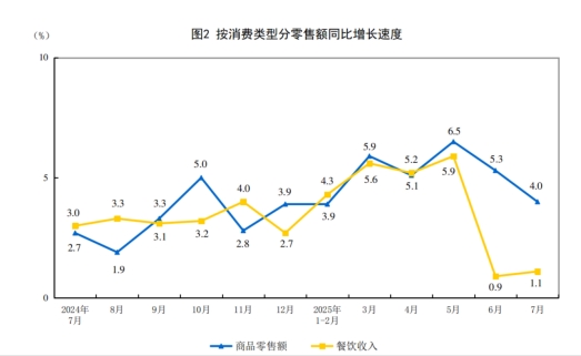 按消費類型分,7月份,商品零售額34276億元,同比增長4.0%;餐飲收入4504億元,增長1.1%。1—7月份,商品零售額252254億元,增長4.9%;餐飲收入31984億元,增長3.8%。