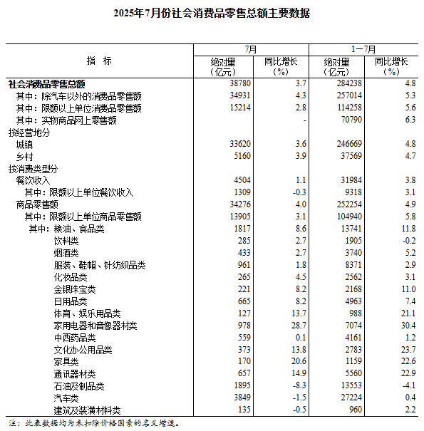 7月份,社會消費品零售總額38780億元,同比增長3.7%。其中,除汽車以外的消費品零售額34931億元,增長4.3%。1—7月份,社會消費品零售總額284238億元,增長4.8%。其中,除汽車以外的消費品零售額257014億元,增長5.3%。