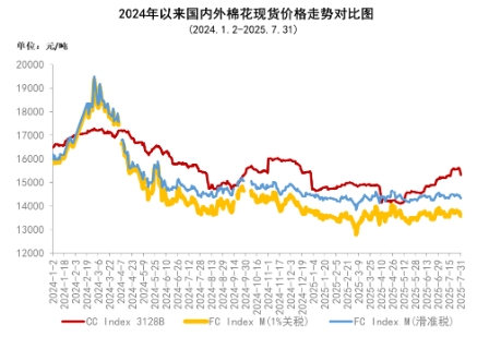 7月國內(nèi)棉花價格總體上漲,主要是宏觀氛圍向好、市場供應(yīng)預(yù)期偏緊對棉價形成利多影響。中央財經(jīng)委會議研究縱深推進全國統(tǒng)一大市場建設(shè)、國家統(tǒng)計局公布我國上半年經(jīng)濟運行情況、新疆發(fā)布進一步完善紡織服裝產(chǎn)業(yè)政策措施等因素提振市場信心,疊加棉花商業(yè)庫存持續(xù)減少、部分產(chǎn)區(qū)遭遇不利天氣、進口量顯著下降引發(fā)市場供應(yīng)減少擔(dān)憂,帶動國內(nèi)棉價持續(xù)上漲,月末因觀望中美貿(mào)易談判略有回落。同期,國際棉價受巴西和澳大利亞棉花豐產(chǎn)致市場供應(yīng)寬松、美國關(guān)稅政策的不確定抑制美棉出口需求等因素影響呈震蕩下跌走勢,整體弱于國內(nèi)。