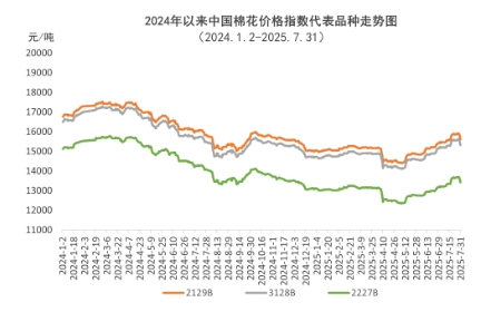 7月中國棉花價格指數(shù)沖高后小幅回落,受一系列宏觀消息和供應(yīng)趨緊預(yù)期推動,中國棉花價格指數(shù)震蕩上行,月中走高至15500元/噸上方。月末因美國對等關(guān)稅即將實施,商品市場整體回落,產(chǎn)業(yè)信心受挫,中國棉花價格指數(shù)下行至15325元/噸左右。7月中國棉花價格指數(shù)(CCIndex3128B)月均價為15362元/噸,環(huán)比上漲545元,同比下跌311元。