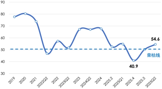 2025年上半年,世界經(jīng)濟復蘇乏力,單邊主義、保護主義加劇,多邊主義、自由貿(mào)易受到嚴峻挑戰(zhàn);國內(nèi)經(jīng)濟運行總體平穩(wěn)、穩(wěn)中向好,在復雜多變的國內(nèi)外環(huán)境中展現(xiàn)了強大的韌性和活力。我國產(chǎn)業(yè)用紡織品行業(yè)克服了國內(nèi)外多重不利因素影響,保持了穩(wěn)中有進的態(tài)勢。根據(jù)協(xié)會調(diào)研,2025年上半年我國產(chǎn)業(yè)用紡織品行業(yè)的景氣指數(shù)為54.6,處于微景氣區(qū)間(圖1)。