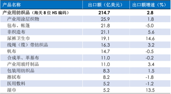 分產(chǎn)品來看,產(chǎn)業(yè)用涂層織物是行業(yè)出口金額最大的產(chǎn)品,出口額達到25.9億美元,同比增長1.8%;氈布/帳篷的出口額為21.8億美元,同比下降5%;非織造布及其制品的海外需求整體保持穩(wěn)定,非織造布卷材的出口額為21.1億美元,同比增長5.6%,一次性衛(wèi)生用品(尿褲、衛(wèi)生巾等)和濕巾的出口額分別達到19.1億美元和5.2億美元,分別同比增長14.6%和13.5%,擦拭布(不含濕巾)和醫(yī)用敷料的出口額分別為8.2億美元和5.2億美元,分別同比下降1.8%和1.2%;傳統(tǒng)產(chǎn)品中,線繩(纜)帶紡織品、產(chǎn)業(yè)用玻纖制品、包裝用紡織品的出口有不同程度的增長,帆布和革基布的出口額增速小幅下降。