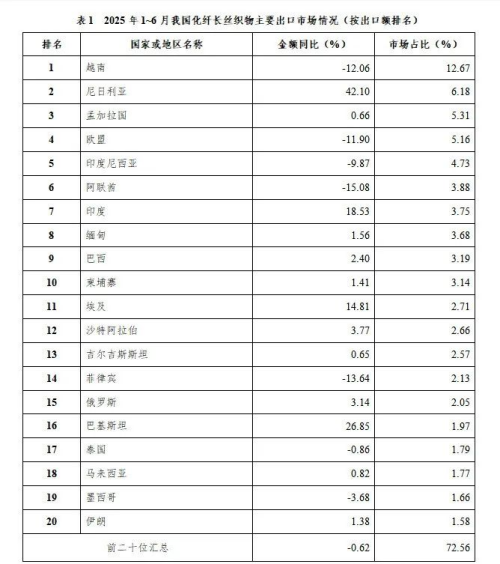 2025年1~6月,我國化纖長絲織物累計出口額超過1億美元的單一市場有25個,主要出口市場中出口額排名前二十的國家和地區(qū)累計出口份額占我國長絲織物出口總額的72.6%。