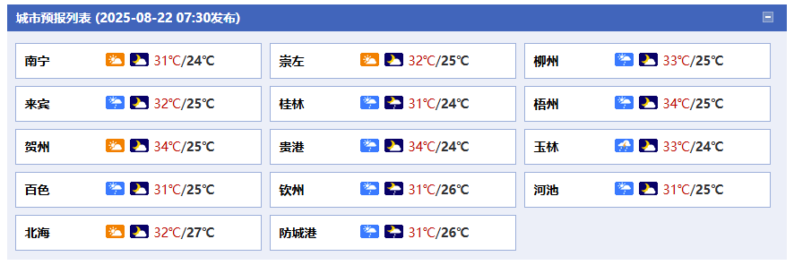 南寧市:今天白天到晚上,多云、局地有雷陣雨,東南風(fēng)2~3級(jí),最高氣溫32℃,最低氣溫25℃。