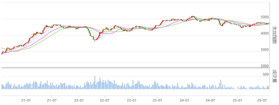 今日(周五)生絲電子盤面各遠近月合約價格維持小幅波動,整體延續(xù)盤整態(tài)勢。其中,現(xiàn)貨月 250825 生絲合約持倉量繼續(xù)增加,隨著下周實物交收窗口臨近,買賣雙方結合盤面進行買賣的步伐有所加快。從周K線來看,本周4A級生絲電子指數(shù)收出帶有上下影線的小陰線,反映全周價格在區(qū)間內震蕩整理蓄勢,等待下一步訊號形成方向突破。