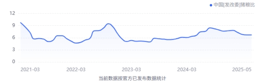 豬肉價格走勢進(jìn)一步反映市場需求疲軟與通縮壓力。近期豬價持續(xù)下滑,部分地區(qū)已跌入6元區(qū)。豬糧比呈現(xiàn)波動下降趨勢,從2024年8月的8.44降至2025年5月的6.69。據(jù)發(fā)改委監(jiān)測,近日全國平均豬糧比價跌至6∶1以下。