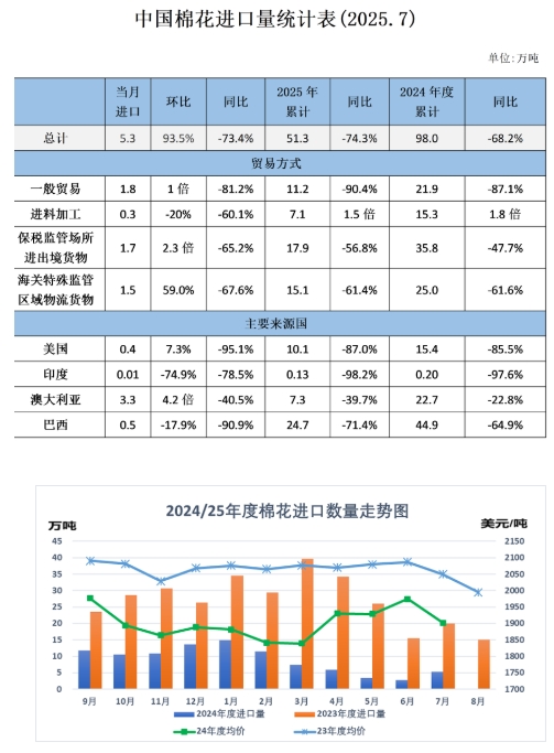 據(jù)海關(guān)總署數(shù)據(jù),7月我國棉花進(jìn)口量為5.3萬噸,同比下降73.4%,環(huán)比增長93.5%,澳大利亞棉花收獲加工進(jìn)度快于去年同期,有效補(bǔ)充市場(chǎng)資源,同時(shí)由于上月基數(shù)較低,本月澳棉進(jìn)口量環(huán)比顯著增長,占比升至首位;巴西、美國棉花進(jìn)口占比進(jìn)一步降低,排在第二和第四。2025年1-7月我國累計(jì)進(jìn)口51.3萬噸,同比下降74.3%。2024/25年度前11個(gè)月共進(jìn)口98萬噸,同比下降68.2%。