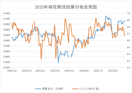 期貨方面:本月鄭棉期貨市場(chǎng)整體呈現(xiàn)震蕩上行走勢(shì),棉花銷售基差保持穩(wěn)定,受紡織企業(yè)“隨用隨買”采購(gòu)策略影響,現(xiàn)貨成交活躍度不高。疊加近期棉花期貨價(jià)格堅(jiān)挺,進(jìn)一步抑制了現(xiàn)貨批量采購(gòu)需求,導(dǎo)致市場(chǎng)交投偏冷。截至8月28日,鄭棉主力合約結(jié)算價(jià)為14070,較月初上漲3.34%。美棉方面,行情先漲后跌,截至8月27日主力合約結(jié)算價(jià)為66.68美分/磅,較月初的66.36上漲0.5%。