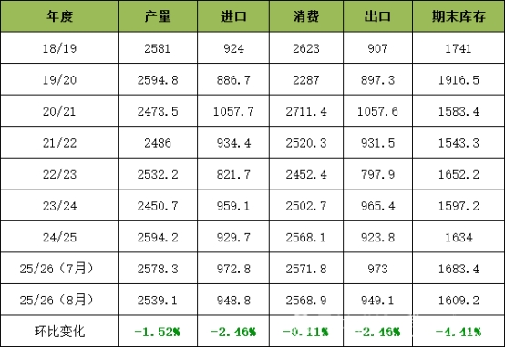 USDA 全球產(chǎn)銷存預(yù)測(cè)8月 單位:萬(wàn)噸