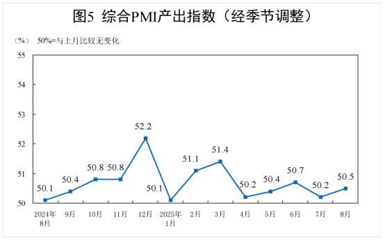 8月份,綜合PMI產(chǎn)出指數(shù)為50.5%,比上月上升0.3個百分點,持續(xù)高于臨界點,表明我國企業(yè)生產(chǎn)經(jīng)營活動總體擴張有所加快。