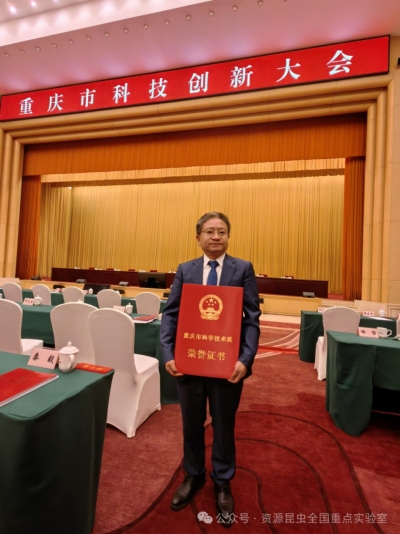 資源昆蟲(chóng)全國(guó)重點(diǎn)實(shí)驗(yàn)室完成的“家蠶泛基因組與重要性狀遺傳基礎(chǔ)研究”榮獲2024年度重慶市自然科學(xué)一等獎(jiǎng),成果負(fù)責(zé)人代方銀教授出席大會(huì)并上臺(tái)領(lǐng)獎(jiǎng)。