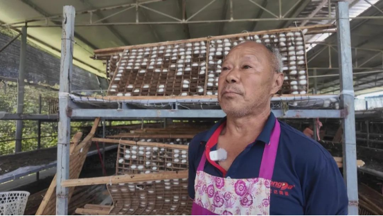 黔江區(qū)石家鎮(zhèn)馬腦頂村蠶桑基地管理人員 陳云江:我們這一季一共養(yǎng)了56張蠶,產(chǎn)量比較高,每張有80斤左右,整體收入可能有十萬元。