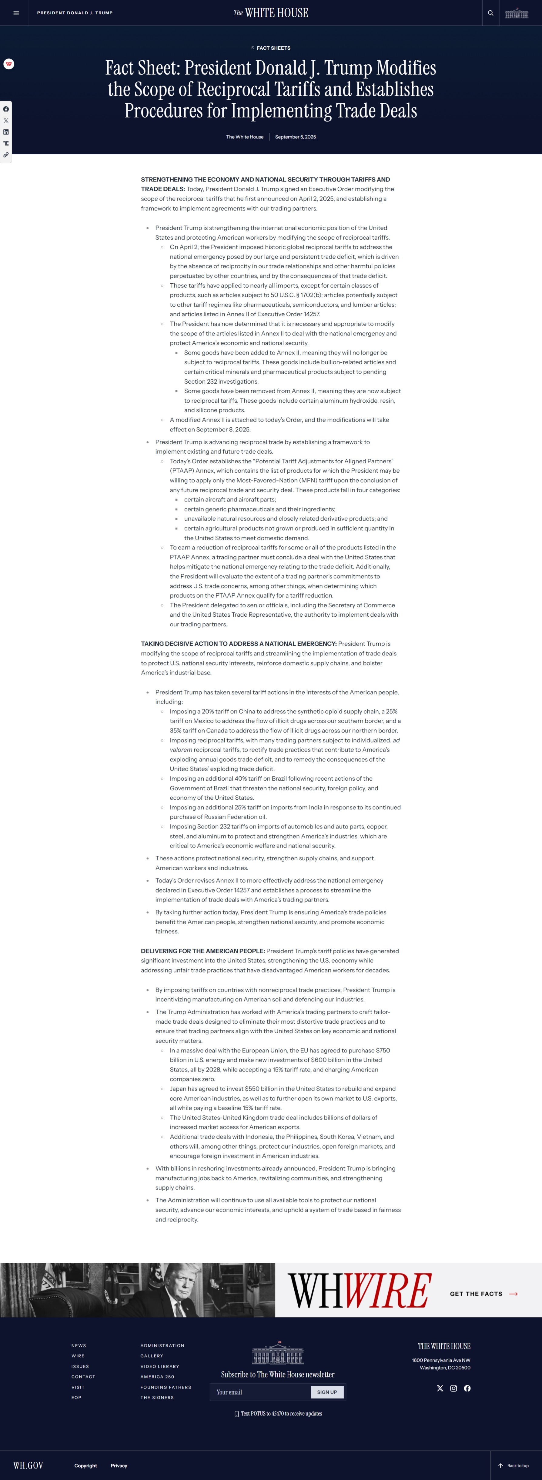 通過關稅與貿易協定強化經濟與國家安全:今日,唐納德?J?特朗普總統(tǒng)簽署一項行政命令,調整其于 2025 年 4 月 2 日首次宣布的對等關稅范圍,并建立框架以落實與貿易伙伴的各項協定。