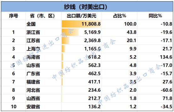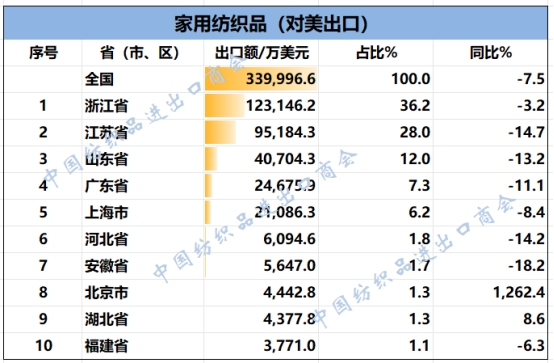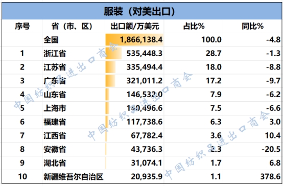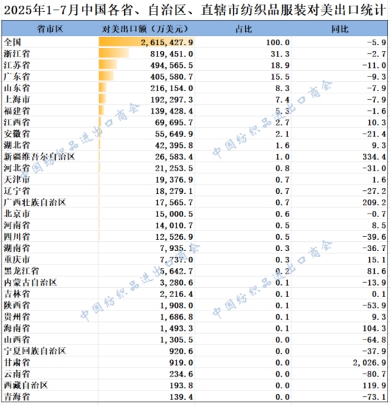 2025年1-7月我國紡織服裝重點(diǎn)省市對(duì)美出口概況