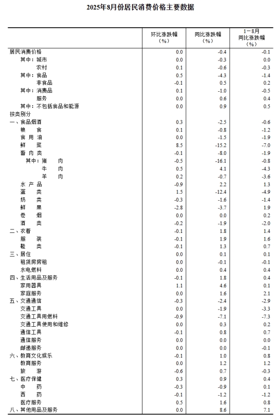 2025年8月份,全國居民消費(fèi)價(jià)格同比下降0.4%。其中,城市下降0.3%,農(nóng)村下降0.6%;食品價(jià)格下降4.3%,非食品價(jià)格上漲0.5%;消費(fèi)品價(jià)格下降1.0%,服務(wù)價(jià)格上漲0.6%。1—8月平均,全國居民消費(fèi)價(jià)格比上年同期下降0.1%。