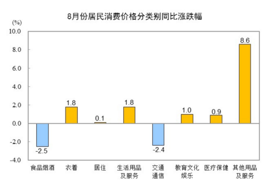 8月份,食品煙酒類價(jià)格同比下降2.5%,影響CPI(居民消費(fèi)價(jià)格指數(shù))下降約0.72個(gè)百分點(diǎn)。食品中,鮮菜價(jià)格下降15.2%,影響CPI下降約0.37個(gè)百分點(diǎn);蛋類價(jià)格下降12.4%,影響CPI下降約0.08個(gè)百分點(diǎn);畜肉類價(jià)格下降8.0%,影響CPI下降約0.25個(gè)百分點(diǎn),其中豬肉價(jià)格下降16.1%,影響CPI下降約0.24個(gè)百分點(diǎn);鮮果價(jià)格下降3.7%,影響CPI下降約0.08個(gè)百分點(diǎn);糧食價(jià)格下降0.8%,影響CPI下降約0.01個(gè)百分點(diǎn);水產(chǎn)品價(jià)格上漲2.2%,影響CPI上漲約0.04個(gè)百分點(diǎn)。