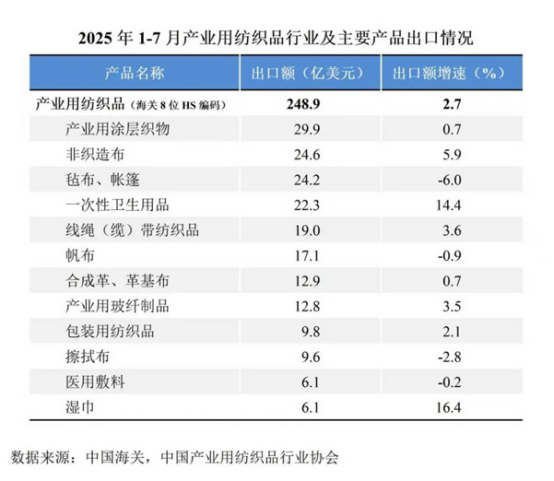 國際貿(mào)易方面,根據(jù)中國海關(guān)數(shù)據(jù)(海關(guān)8位HS編碼統(tǒng)計數(shù)據(jù)),2025年1-7月我國產(chǎn)業(yè)用紡織品行業(yè)的出口額為248.9億美元,同比增長2.7%;行業(yè)進口額為31.4億美元,同比增長3.8%。