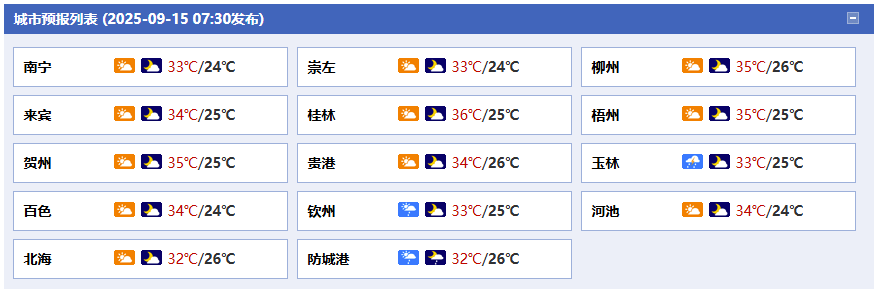 南寧市:今天白天到晚上,多云間晴、午后局地有陣雨或雷雨,東南風1~2級,最高氣溫33℃,最低氣溫25℃。