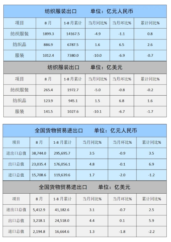 2025年1-8月,紡織服裝累計出口14167.5億元,比去年同期(下同)增長0.8%,其中紡織品出口6787.5億元,增長2.6%,服裝出口7380億元,下降0.7%。