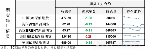 【1】WTI主力原油期貨收跌0.12美元,跌幅0.19%,報(bào)62.28美元/桶;布倫特主力原油期貨收跌0.07美元,跌幅0.11%,報(bào)65.97美元/桶;INE原油期貨收跌1.38%,報(bào)477.5元。