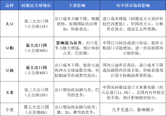 此外國際競爭格局改變,阿根廷農(nóng)產(chǎn)品出口成本大幅降低(理想情況下約降低24.5%),使其在國際市場上更具價格優(yōu)勢。美國大豆出口將雪上加霜,面臨更直接的競爭。巴西雖是目前中國主要大豆供應(yīng)國,也可能被迫調(diào)整報價。