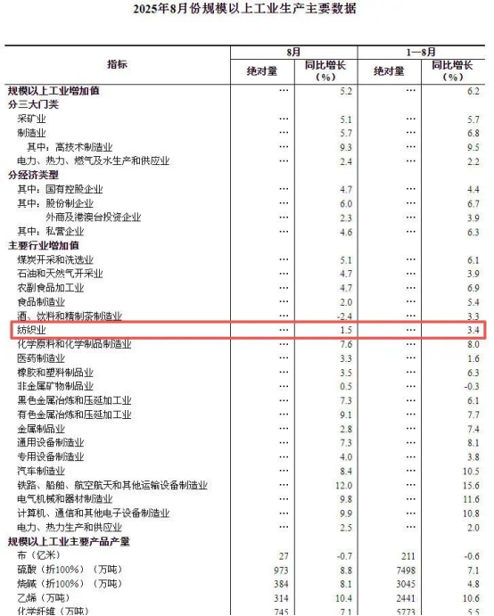 分行業(yè)看,8月份,41個大類行業(yè)中有31個行業(yè)增加值保持同比增長。其中,煤炭開采和洗選業(yè)增長5.1%,石油和天然氣開采業(yè)增長4.7%,農(nóng)副食品加工業(yè)增長4.7%,酒、飲料和精制茶制造業(yè)下降2.4%,紡織業(yè)增長1.5%,化學(xué)原料和化學(xué)制品制造業(yè)增長7.6%,非金屬礦物制品業(yè)增長0.5%,黑色金屬冶煉和壓延加工業(yè)增長7.3%,有色金屬冶煉和壓延加工業(yè)增長9.1%,通用設(shè)備制造業(yè)增長7.3%,專用設(shè)備制造業(yè)增長4.0%,汽車制造業(yè)增長8.4%,鐵路、船舶、航空航天和其他運(yùn)輸設(shè)備制造業(yè)增長12.0%,電氣機(jī)械和器材制造業(yè)增長9.8%,計算機(jī)、通信和其他電子設(shè)備制造業(yè)增長9.9%,電力、熱力生產(chǎn)和供應(yīng)業(yè)增長2.5%。