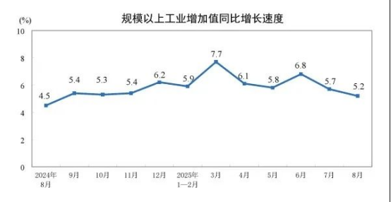 8月份,規(guī)模以上工業(yè)增加值同比實(shí)際增長5.2%(增加值增速均為扣除價格因素的實(shí)際增長率)。從環(huán)比看,8月份,規(guī)模以上工業(yè)增加值比上月增長0.37%。1—8月份,規(guī)模以上工業(yè)增加值同比增長6.2%。