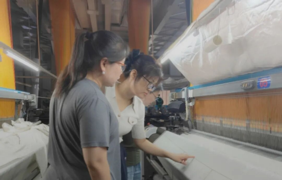 會(huì)后,老師們走進(jìn)生產(chǎn)車(chē)間,了解劍桿提花織機(jī)的裝造規(guī)格及現(xiàn)有品種的織造過(guò)程,并在織機(jī)上與設(shè)計(jì)人員一同探討花型織造中出現(xiàn)的問(wèn)題。