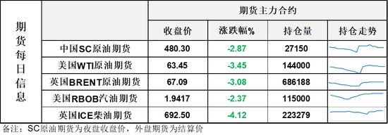 【1】WTI主力原油期貨收跌2.27美元,跌幅3.45%,報63.45美元/桶;布倫特主力原油期貨收跌2.13美元,跌幅3.08%,報67.09美元/桶;INE原油期貨收跌2.87%,報480.3元。