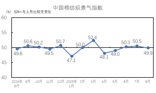 2025年8月,生產(chǎn)指數(shù)為49.9%,低于臨界點(diǎn),較7月下降0.1個(gè)百分點(diǎn),紡織廠生產(chǎn)較7月下降。從分項(xiàng)指數(shù)看,棉紡織廠設(shè)備開臺(tái)率指數(shù)為49.3%,低于臨界點(diǎn),較7月下降1.1個(gè)百分點(diǎn)。紗產(chǎn)量指數(shù)為51.1%,較7月上升1.5個(gè)百分點(diǎn);布產(chǎn)量指數(shù)為49.4%,較7月下降0.2個(gè)百分點(diǎn);紗產(chǎn)量指數(shù)高于臨界點(diǎn),布產(chǎn)量指數(shù)低于臨界點(diǎn)。