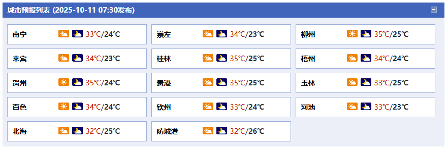 南寧市:今天白天到晚上,多云到晴、局地有陣雨或雷雨,東南風1~2級,最高氣溫33℃,最低氣溫25℃。