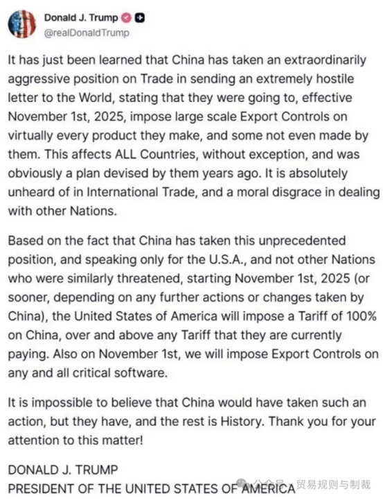 當?shù)貢r間2025年10月10日,美國總統(tǒng)特朗普在社交媒體上宣布:從11月1日起,對中國產(chǎn)品征收100%關(guān)稅;并對所有關(guān)鍵軟件實施出口管制。理由是,中國在10日9日發(fā)布對相關(guān)稀土實施出口管制的決定。在此消息影響下,S&P500指數(shù)當日跌幅達-3.5%,在6個小時內(nèi)損失2.5萬億美元。