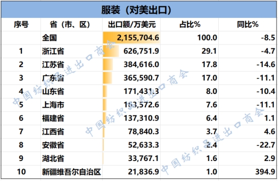 2025年1-8月,紡織服裝類重點商品對美出口前十名的省(市、區(qū))
