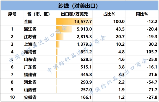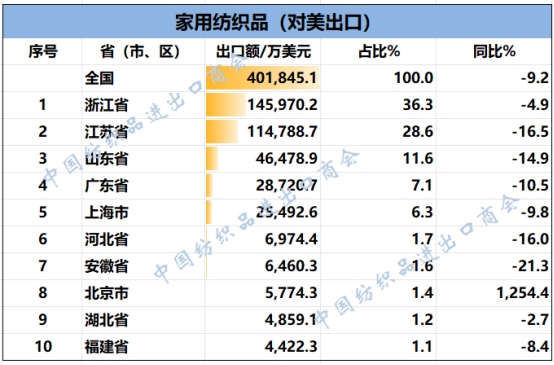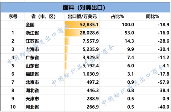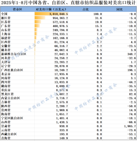 2025年1-8月,我國紡織服裝累計對美出口301.88億美元,同比下降9%。浙江省、江蘇省、廣東省、山東省、上海分別列全國紡織服裝對美出口省市前五位,合計比重超八成。