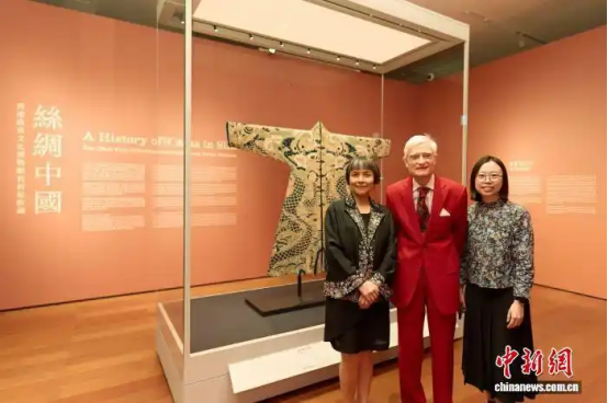 圖為香港故宮文化博物館副館長(zhǎng)王伊悠(左)、香港知名中國(guó)紡織藝術(shù)收藏家賀祈思(中)等嘉賓合影。 (香港故宮文化博物館供圖)