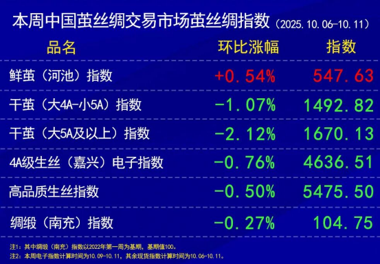 10月以來(lái),處于代表性廣西宜州等地的第三批秋繭上市后期和第四批秋繭上市期,工廠(chǎng)收購(gòu)價(jià)格多集中在每公斤50-56元之間,受到9月中下旬天氣高溫導(dǎo)致桑葉產(chǎn)量下降、家蠶二分濃核病在桂南、桂中、桂西北蠶區(qū)有所擴(kuò)散等綜合因素影響,10月以來(lái)的廣西秋繭上市量下降,毛折普遍較大,凈度普遍偏低。蠶繭原料成本抬升。同時(shí),廣西以外的鮮繭也持續(xù)向廣西集中。根據(jù)協(xié)作單位所報(bào)數(shù)據(jù)轉(zhuǎn)化,鮮繭價(jià)格指數(shù)同比9月末上漲0.54%報(bào)收于547.63點(diǎn)。