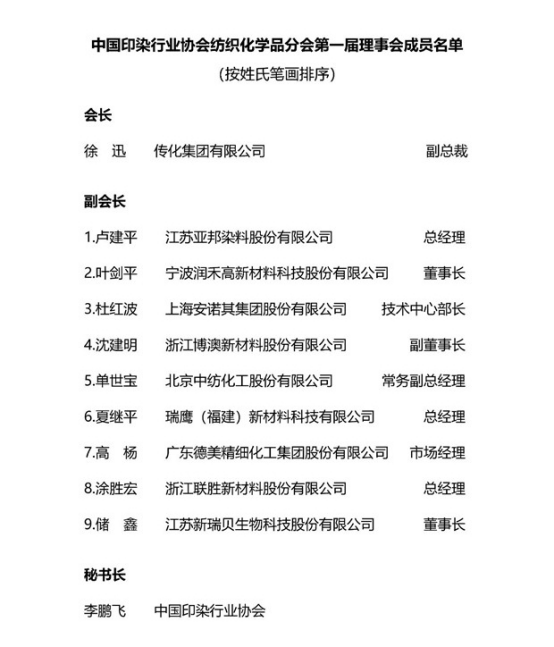 中國印染行業(yè)協(xié)會紡織化學(xué)品分會第一屆理事會成員名單