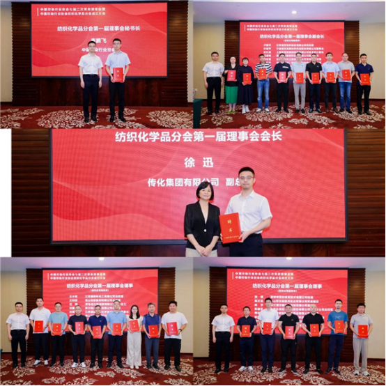 中國印染行業(yè)協(xié)會會長林琳為紡織化學(xué)品分會會長徐迅頒發(fā)了聘書,徐迅會長為分會副會長、秘書長、理事頒發(fā)了聘書。