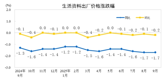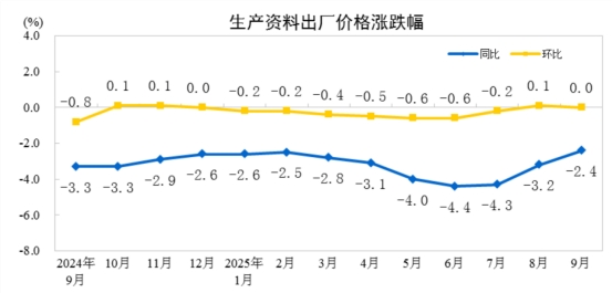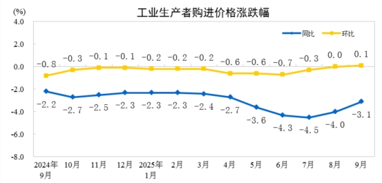 2025年9月份,全國工業(yè)生產(chǎn)者出廠價(jià)格同比下降2.3%,降幅比上月收窄0.6個(gè)百分點(diǎn),環(huán)比繼續(xù)持平。工業(yè)生產(chǎn)者購進(jìn)價(jià)格同比下降3.1%,降幅比上月收窄0.9個(gè)百分點(diǎn),環(huán)比上漲0.1%。1—9月平均,工業(yè)生產(chǎn)者出廠價(jià)格比上年同期下降2.8%,工業(yè)生產(chǎn)者購進(jìn)價(jià)格下降3.2%。