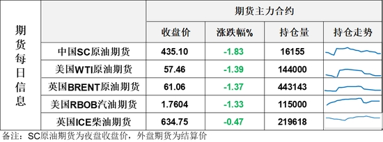 【1】WTI主力原油期貨收跌0.81美元,跌幅1.39%,報57.46美元/桶;布倫特主力原油期貨收跌0.85美元,跌幅1.37%,報61.06美元/桶;INE原油期貨收跌1.83%,報435.1元。