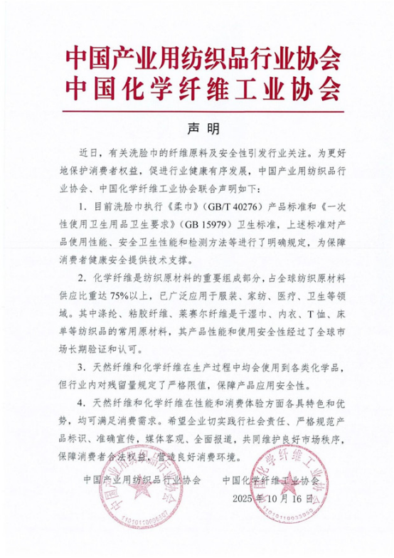 近日,有關(guān)洗臉巾的纖維原料及安全性引發(fā)行業(yè)關(guān)注。為更好地保護(hù)消費(fèi)者權(quán)益,促進(jìn)行業(yè)健康有序發(fā)展,中國產(chǎn)業(yè)用紡織品行業(yè)協(xié)會、中國化學(xué)纖維工業(yè)協(xié)會聯(lián)合聲明如下: