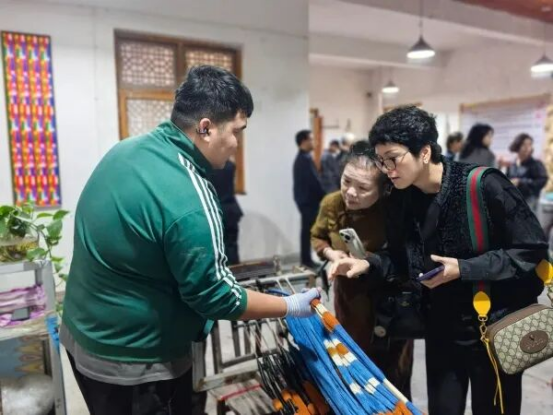 活動當天上午,交流團首站走進和田市吉亞鄉(xiāng)吉亞麗人艾特萊斯絲綢有限責任公司。車間內(nèi),工人們正在展示艾德萊斯絲綢的傳統(tǒng)扎染、印花工序,浙江絲綢工匠們駐足觀摩,不時與和田工匠交流技法細節(jié)。隨后,兩地工匠圍坐在一起,手持絲線切磋工藝手法、探討紋樣創(chuàng)新,古老技藝與現(xiàn)代工藝在交流中碰撞出火花?!暗谝淮谓嚯x接觸艾德萊斯絲綢,其大膽的色彩和獨特的扎染手法讓我深受啟發(fā),未來希望能將兩地技法融合,創(chuàng)作出更有特色的作品?!边_利絲綢(浙江)有限公司技術(shù)中心副主任丁圓圓說。