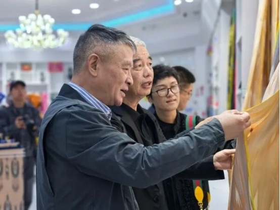 在展示廳內(nèi),交流團一行正專注地鑒賞艾德萊斯綢
