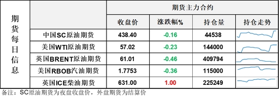 【1】WTI主力原油期貨收跌0.13美元,跌幅0.23%,報57.02美元/桶;布倫特主力原油期貨收跌0.28美元,跌幅0.46%,報61.01美元/桶;INE原油期貨收跌0.16%,報438.4元。