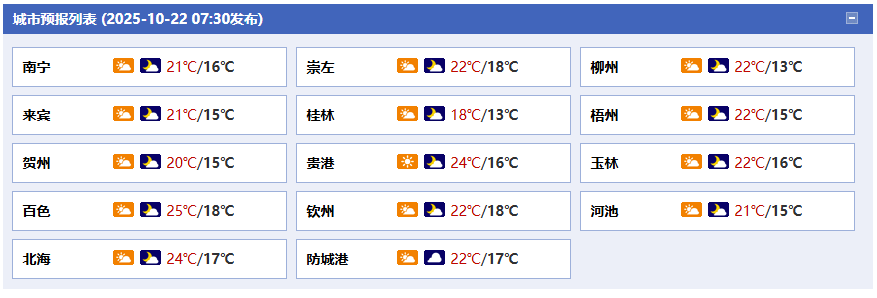 23日白天到24日晚上,全區(qū)多云到晴。各地氣溫:桂北10~25℃,桂南16~26℃。