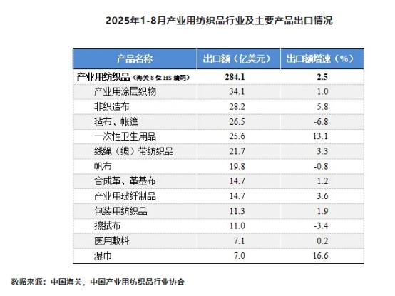 分產(chǎn)品來(lái)看,2025年1-8月,行業(yè)最大出口產(chǎn)品產(chǎn)業(yè)用涂層織物的出口額為34.1億美元,同比增長(zhǎng)1%;非織造布的出口額位居行業(yè)第二,達(dá)到28.2億美元,同比增長(zhǎng)5.8%,同期出口量為110.8萬(wàn)噸,同比增長(zhǎng)12.2%;氈布/帳篷的出口額為26.5億美元,同比下降6.8%;一次性衛(wèi)生用品(尿褲、衛(wèi)生巾等)的出口額為25.6億美元,同比增長(zhǎng)13.1%;其他重點(diǎn)產(chǎn)品方面,產(chǎn)業(yè)用玻纖制品、線繩(纜)帶紡織品、包裝用紡織品和革基布的出口額分別同比增長(zhǎng)3.6%、3.3%、1.9%和1.2%;擦拭類產(chǎn)品方面,擦拭布(不含濕巾)的出口額為11億美元,同比下降3.4%,濕巾出口額達(dá)到7億美元,同比增長(zhǎng)16.6%。
