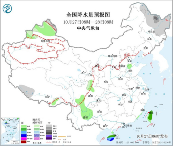 中央氣象臺(tái)預(yù)計(jì),今天,新疆北疆北部、黑龍江中東部、西藏西南部等地部分地區(qū)有小雪或雨夾雪,其中,黑龍江北部等地部分地區(qū)有中到大雪。海南島、臺(tái)灣島大部等地部分地區(qū)有中到大雨,其中,海南島南部等地部分地區(qū)有暴雨。