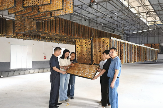 在柳城縣沖脈鎮(zhèn)春綠桑蠶專業(yè)合作社的標(biāo)準(zhǔn)化蠶房?jī)?nèi),豐收景象惹人注目。金黃色蠶繭掛滿蠶蔟,色澤鮮亮奪目,宛如綴滿枝頭的“黃金果”。“桂蠶12號(hào)”是2022年通過(guò)省級(jí)審定的抗逆性天然黃繭新品種,黃繭率達(dá)到100%,其抗血液型膿病能力較傳統(tǒng)品種提升1000倍。服務(wù)組在合作社詳細(xì)了解該品種的飼養(yǎng)情況,實(shí)地開(kāi)展高產(chǎn)、優(yōu)質(zhì)種養(yǎng)配套技術(shù)指導(dǎo)。