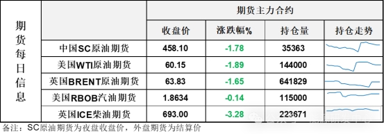 【1】WTI主力原油期貨收跌1.16美元,跌幅1.89%,報(bào)60.15美元/桶;布倫特主力原油期貨收跌1.07美元,跌幅1.65%,報(bào)63.83美元/桶;INE原油期貨收跌1.78%,報(bào)458.1元。